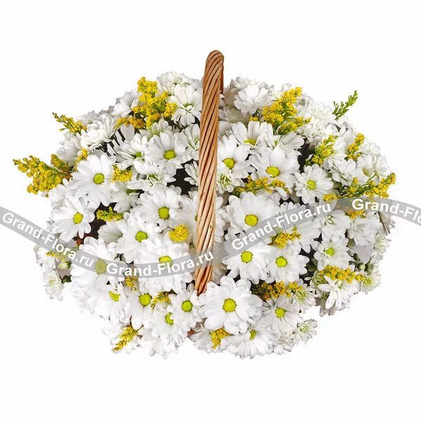 Яркие белоснежные хризантемы просто созданы, чтобы поднимать настроение, настраивать на приятные эмоции и создавать атмосферу доброты. Чудесная флористическая композиция в корзине оснащена зеленым оазисом, благодаря нему цветы надолго сохранят свою свежесть и красоту. В качестве озорных ноток в букете представлены веточки солидаго, они словно лучики солнца осветят лицо обладателя корзинки. Вы можете не искать повод, чтобы подарить такую