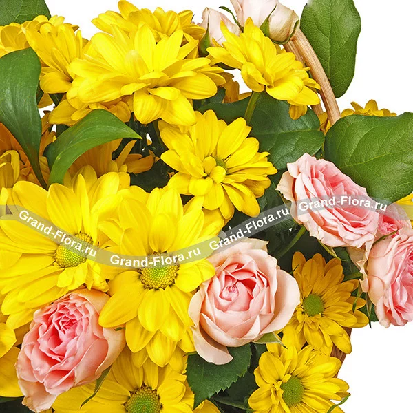 Стандартный (на фото): хризантема кустовая ромашковая - 9 шт., роза кустовая розовая - 3 шт., салал, оазис, корзина.