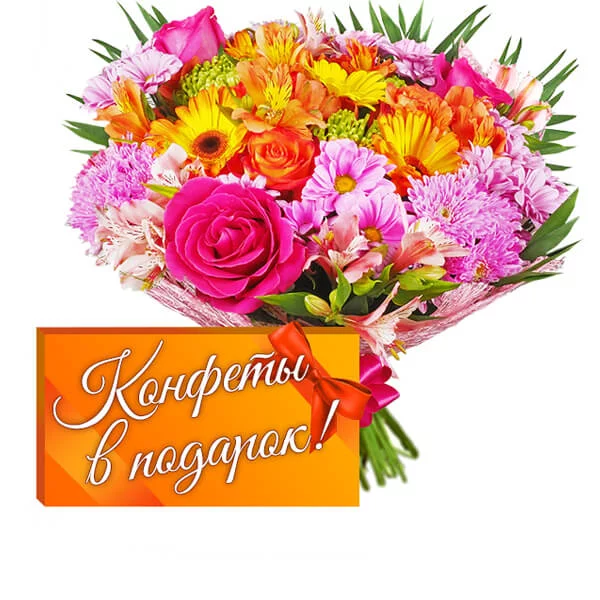 Уменьшенный: хризантема ромашковая фиолетовая - 3 шт, гербера оранжевая - 2 шт, гербера желтая - 1 шт, роза розовая - 2 шт, роза оранжевая - 1 шт, альстромерия оранжевая - 1 шт, альстромерия розовая - 3 шт, хризантема одноголовая зеленая - 1 шт, лист рабелини - 3 шт, натуральная упаковка розовая, бант в тон, + коробка конфет в подарок.