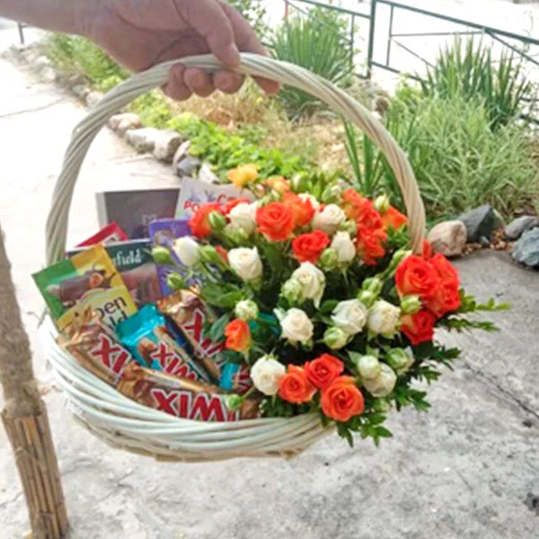 Стандартный: роза кустовая (микс) 20 см - 5 шт., конфеты "DOVE Promises" - 1 шт., шоколад "Milka" - 1 шт., Twix - 3 шт., чай "Greenfield" - 1 шт., печенье "Alpen Gold" - 1 шт., декоративная зелень, оазис, корзина средняя.