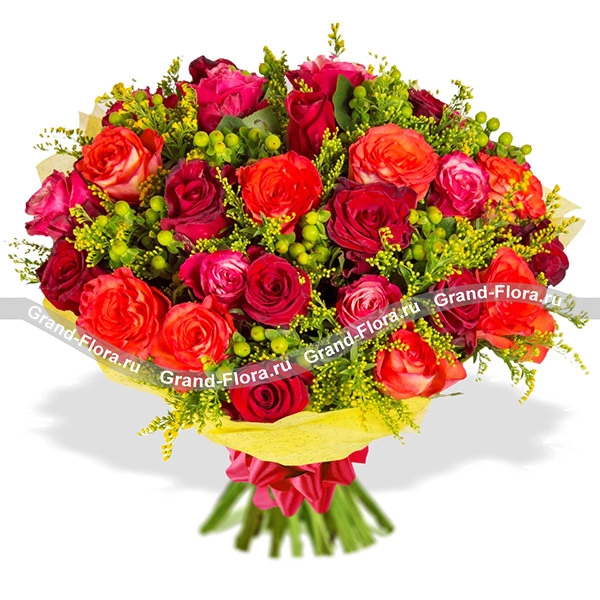 35 роз: роза красная - 13 шт., роза оранжевая - 12 шт., роза розовая - 10 шт., солидаго, гиперикум, фетр желтый, бант красный.