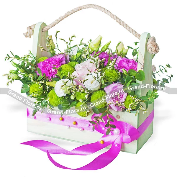 Стандартный: роза розовая - 3 шт., диантус розовый - 3 шт., эустома белая - 1 шт., хризантема кустовая зеленая - 2 шт., декоративная зелень, оазис, деревянное кашпо - 1 шт., декор.