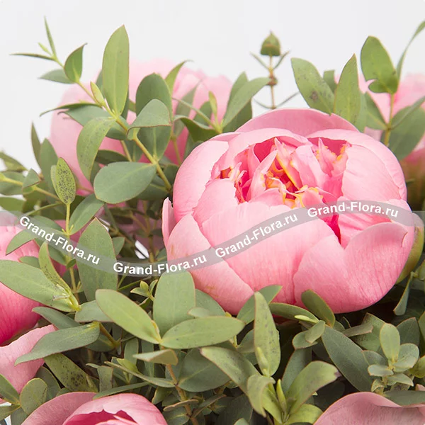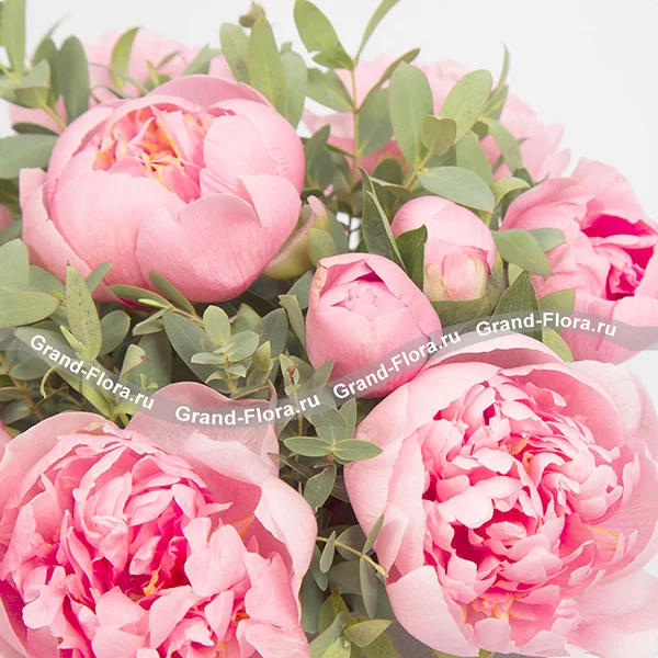 Стандартный: пион розовый - 15 шт., декоративная зелень, оазис, коробка.