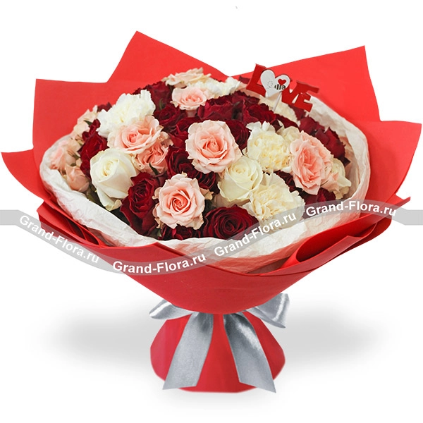 Уменьшенный: роза красная (Россия) 50 см. - 2 шт., роза белая (Россия) 50 см. - 1 шт., роза розовая (Россия) 50 см.- 1 шт., гвоздика белая - 3 шт., упаковка, декор, лента.