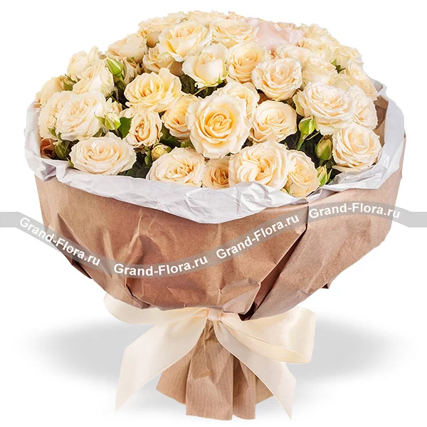 Стандартный: роза кустовая кремовая - 9 шт, упаковка, лента кремовая. Примерный размер: 25Х25 см.